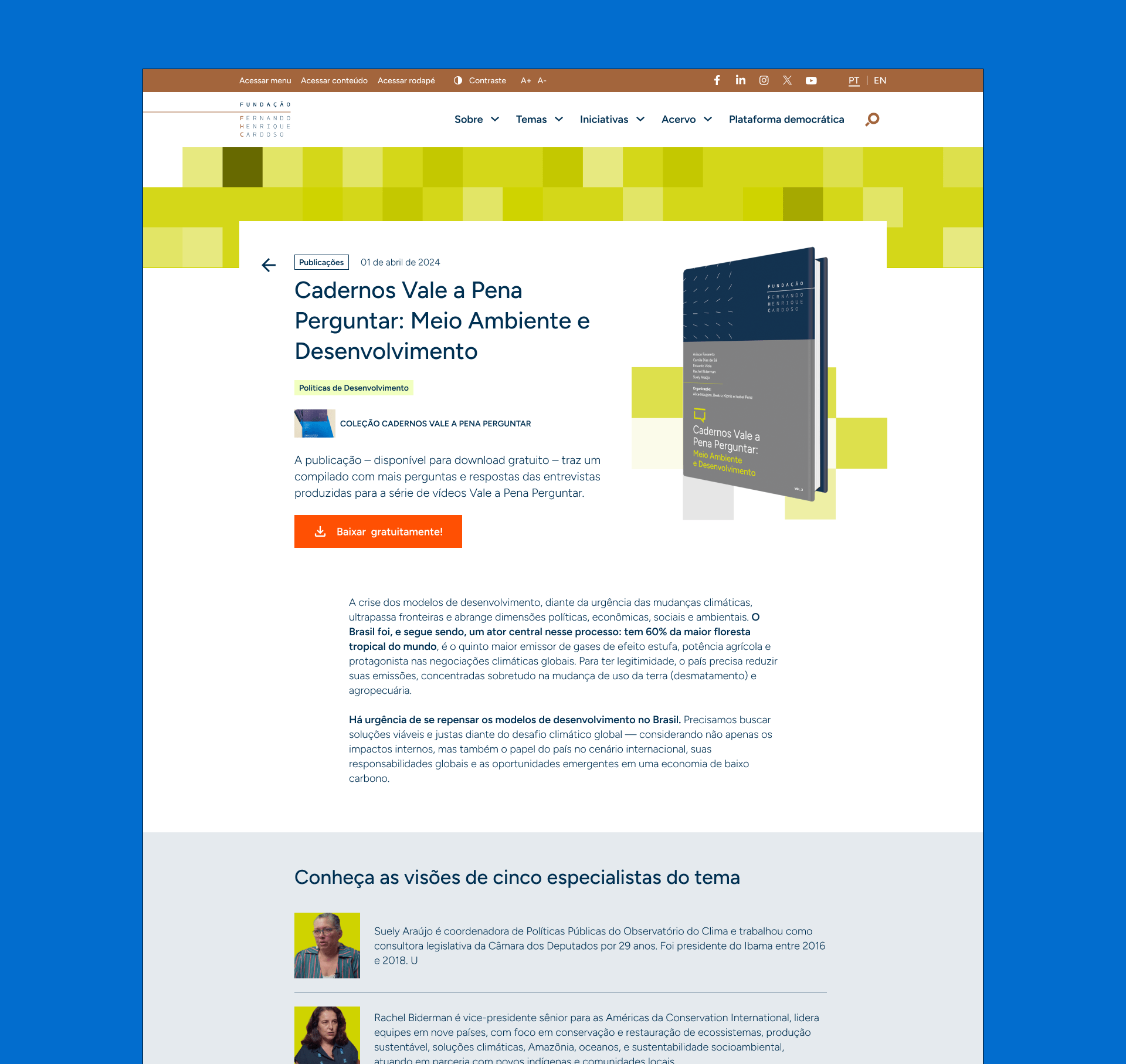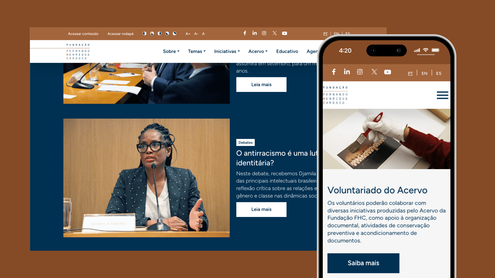 Mantemos uma parceria de longo prazo com a Fundação FHC, acompanhando-a em seus desafios estratégicos e de comunicação institucional. Neste projeto desenhamos e desenvolvemos a nova plataforma institucional que fornece acesso a todo o conhecimento produzido. O trabalho envolveu design estratégico, UX/UI, arquitetura de informação e desenvolvimento web, sempre com o objetivo de traduzir a missão da Fundação em experiências digitais acessíveis, integradas e comprometidas com a democracia e o conhecimento público.