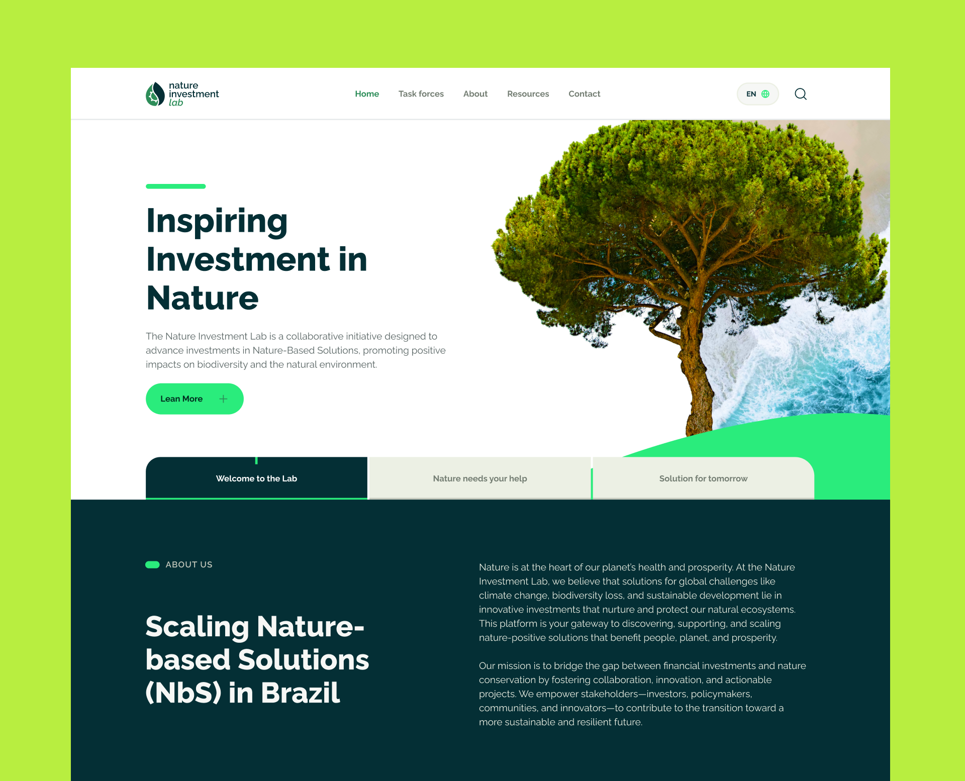 Desenvolvemos a plataforma digital institucional do NIL, incluindo co-criação da narrativa institucional, arquitetura de informação, UX/UI design e desenvolvimento web. A nova plataforma conecta parceiros, investidores e formuladores de políticas, ampliando a transparência e o alcance do movimento por investimentos baseados na natureza.